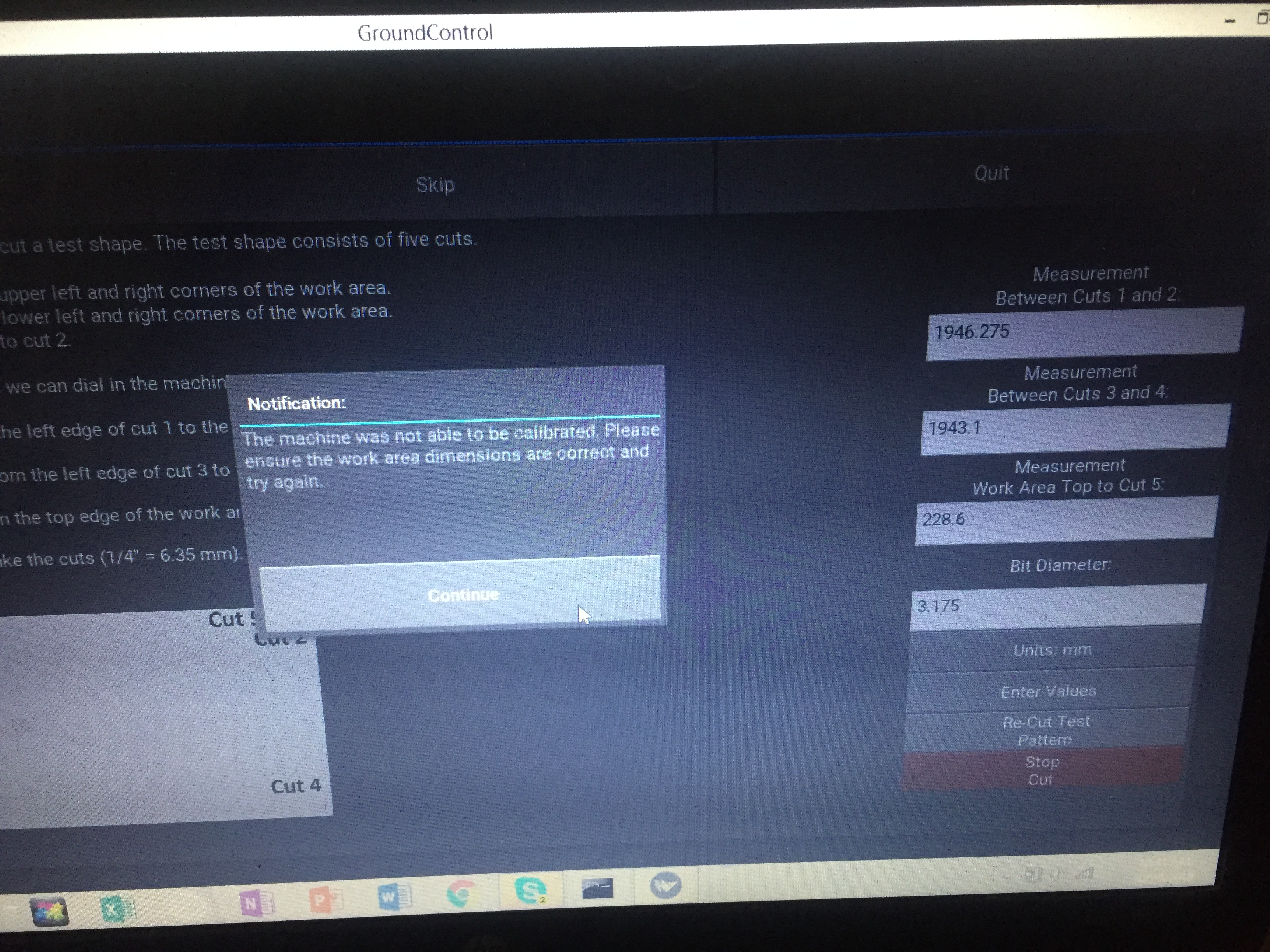while trying to calibrate I get stuck at the end when it is trying to correct for chain sag. I keep getting this popup. I have skipped this and cut a few things before but I’d really like to dial in the accuracy of my Maslow this time. Attached are the popup and the next screen (after skipping chain sag) to show information entered. Any ideas what’s going on?