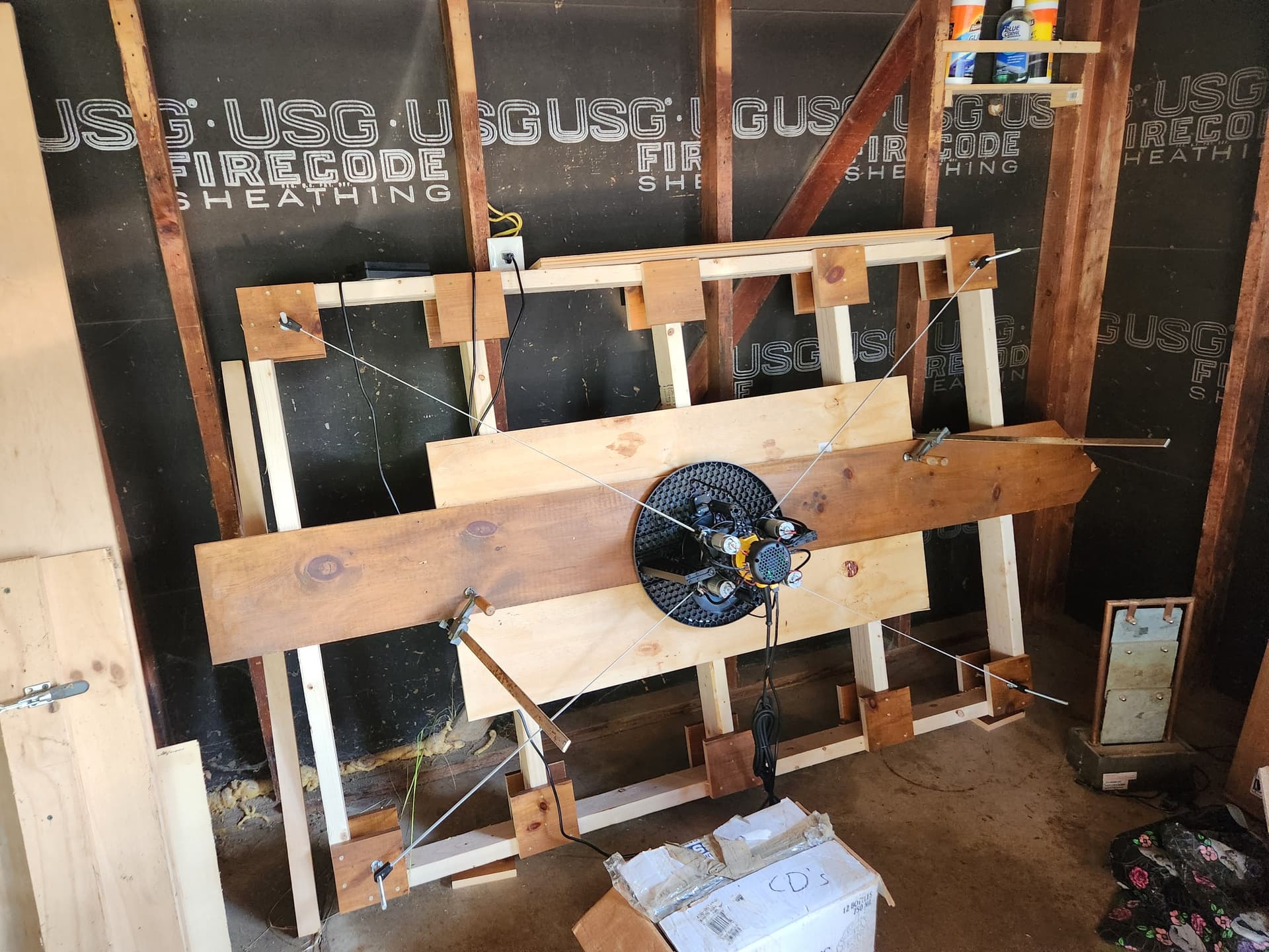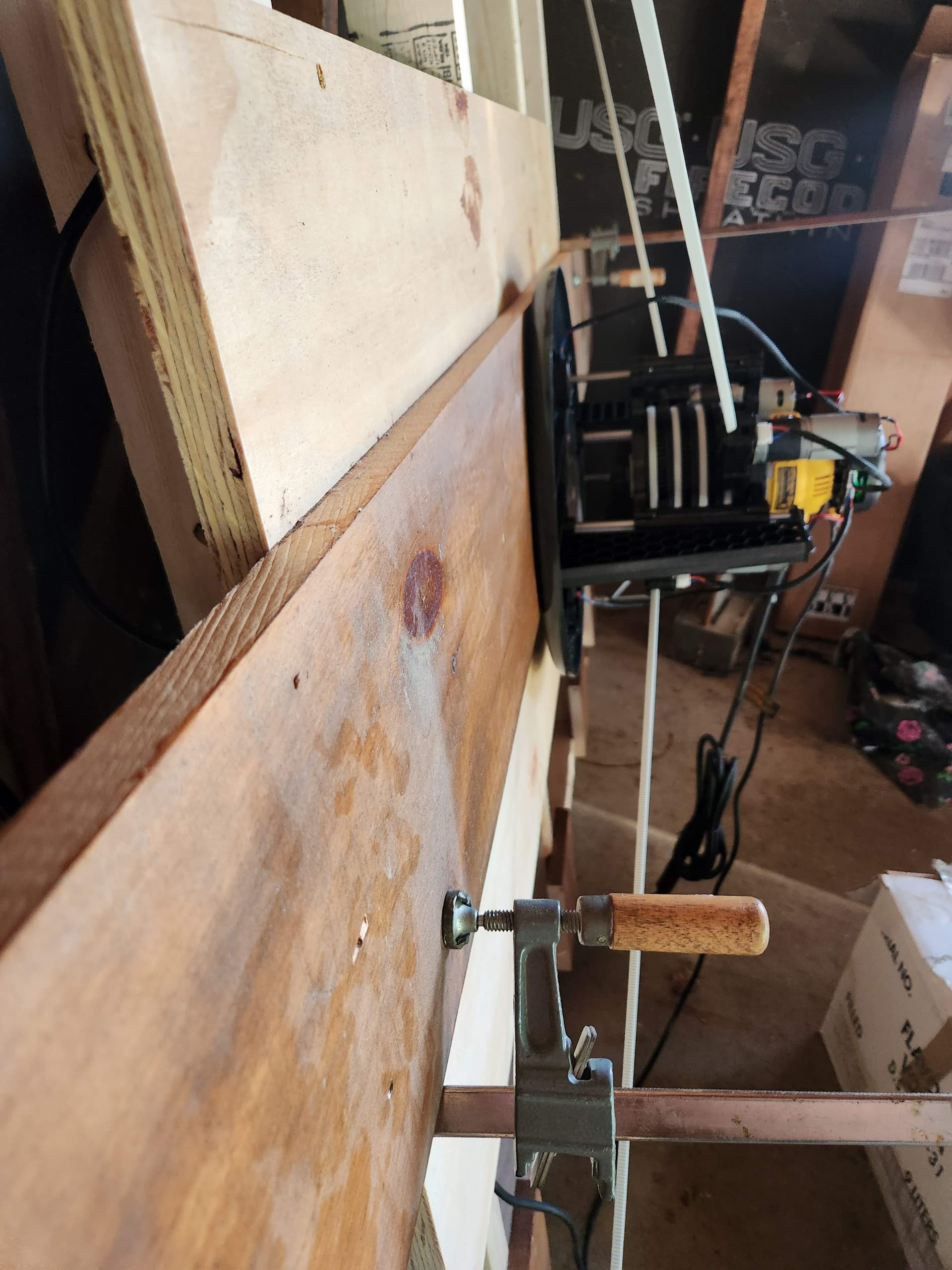 solid 4x8 work table with a piece of sacrificial ply on top and plan to bolt