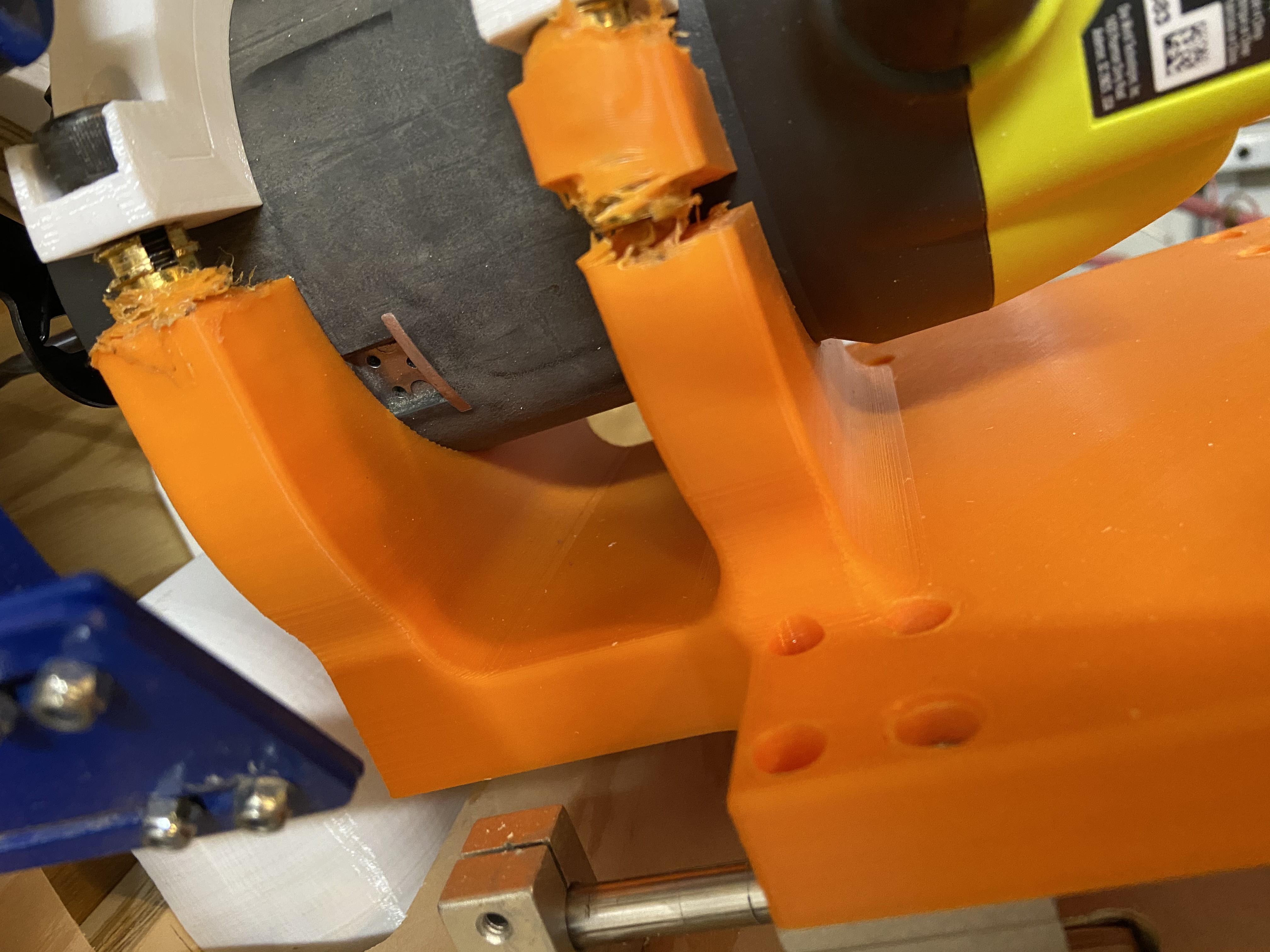 @MeticulousMaynard and @ShadyG: I completely understand on the use and capabilities of PLA/PLA+. I was looking to get the print of the carriage in the other direction, but as you said, it is a bit tricky, and I was having some interesting issues trying to get the supports right. I finished the new print of the carriage, and I will say this thing is very hefty and stout (I’ll provide pictures here in the near future as I am working on getting it put back together. And that is partially a layer failure, but is was also self induced. With the finished carriage, I visited Big Orange today and found I had 3/8 - 16 inserts (waaayyyy too big for those clamp arms), so when I installed them, I pushed out the layer walls, weakening them, and eventually causing them to split under the pressure of the screw and clamp with the router. I got some 5/16 - 18 inserts (the 1/4 - 20 were too small for the recessed holes) and have installed them with no indications of bowing/pushing out on the outer walls. Not to mention I has the clamp arm area increased to 75% infil, as well as actually learned how to install the inserts the correct way, so we’ll see how this works.